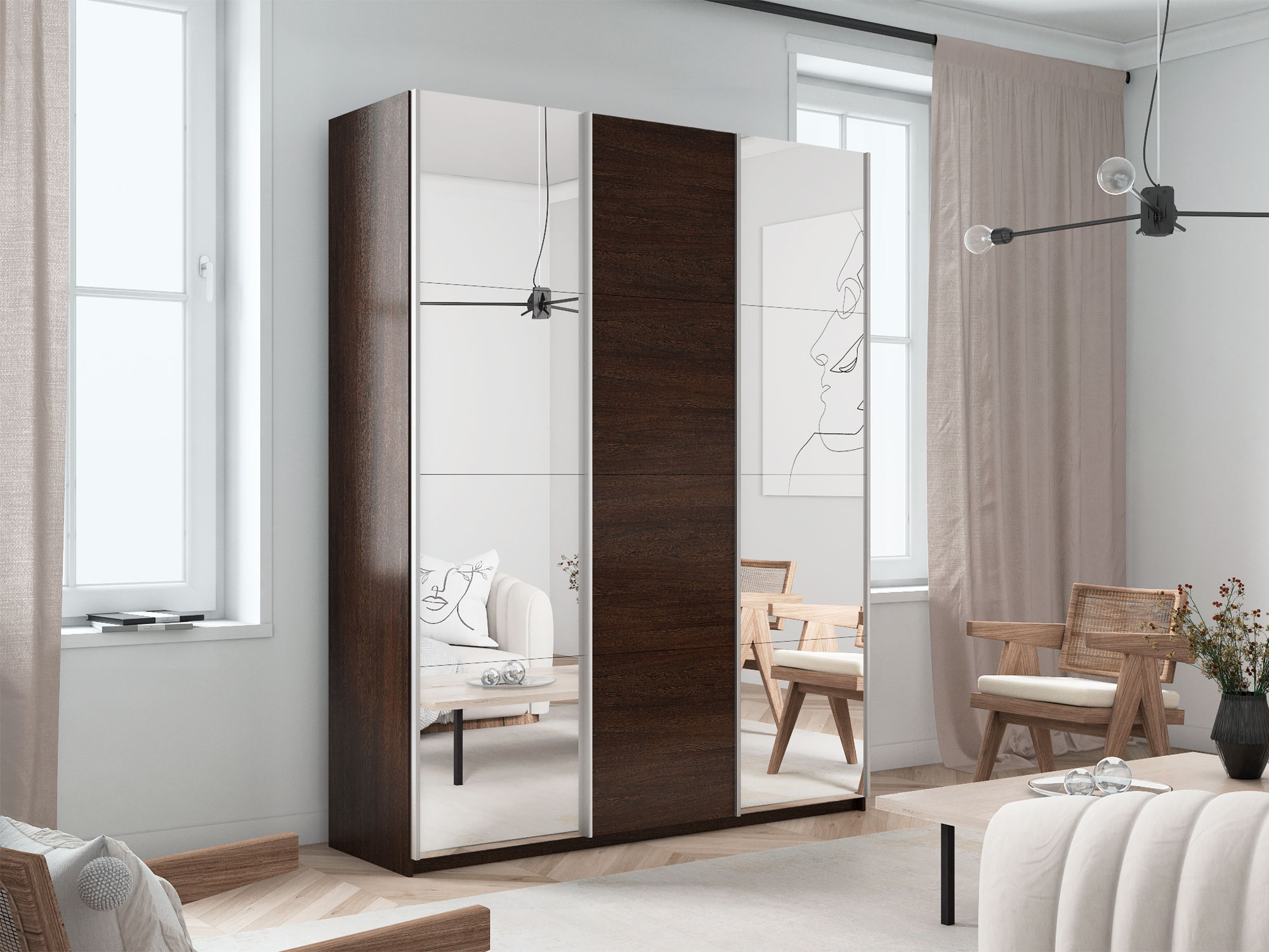 - Шкаф-купе Прайм 3-х дверный 1800 два Зеркала/ДСП Венге