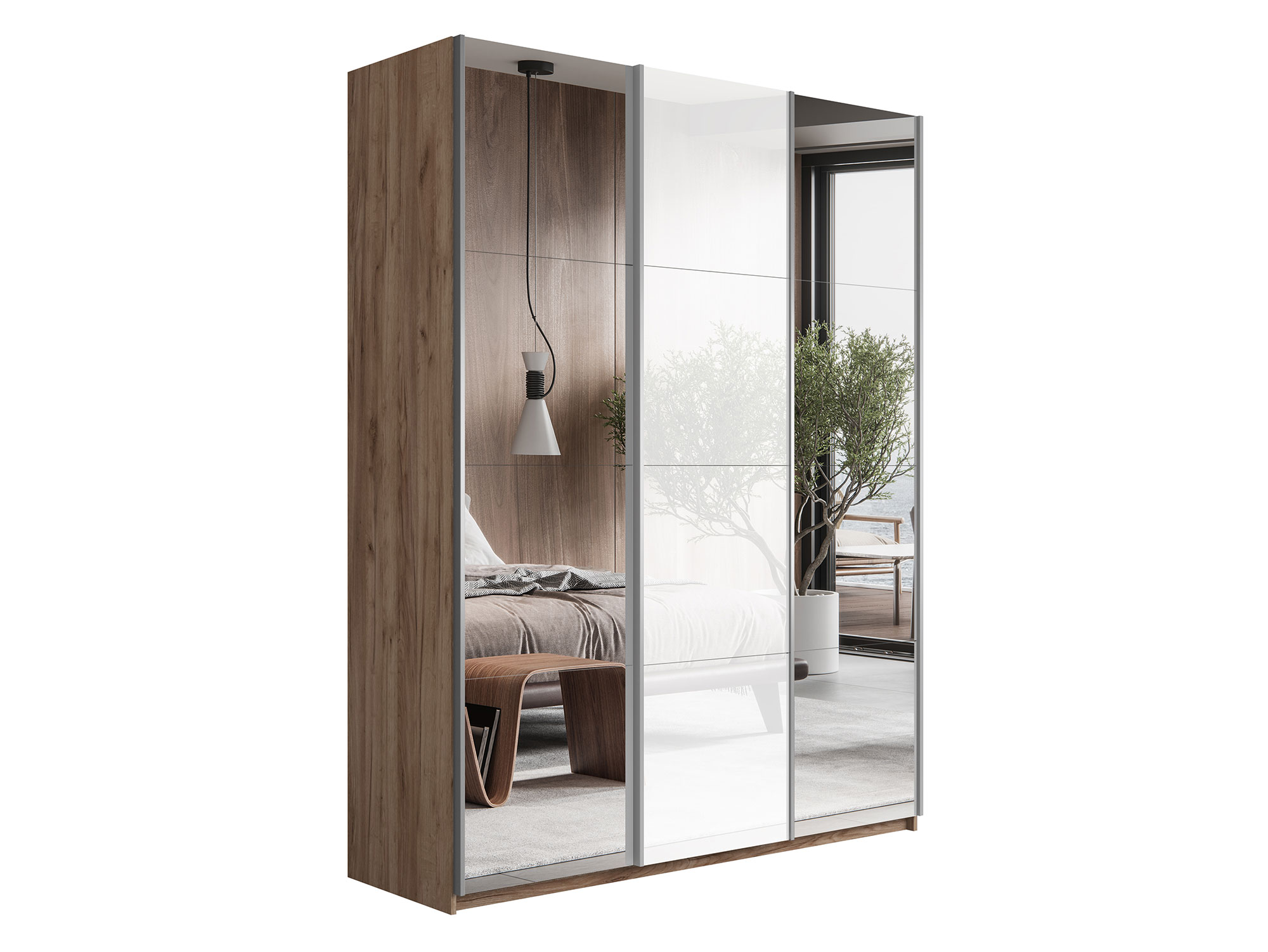 Шкаф-купе Прайм 3-х дверный 1800 Зеркало/Стекло Белое/Зеркало Крафт табачный