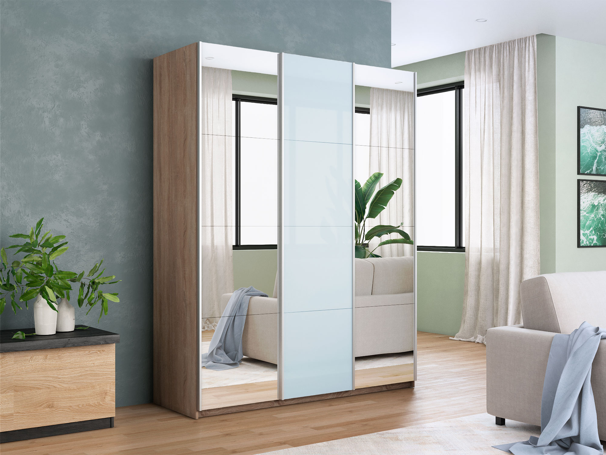 - Шкаф-купе Прайм 3-х дверный 2100 Зеркало/Стекло Белое/Зеркало Сонома