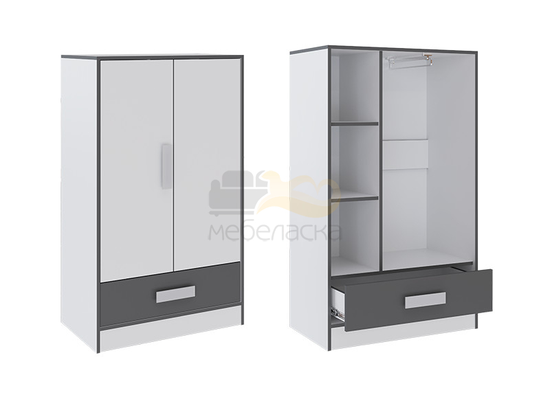 Шкаф декорирован серой кромкой. Ручки: пластик белый
