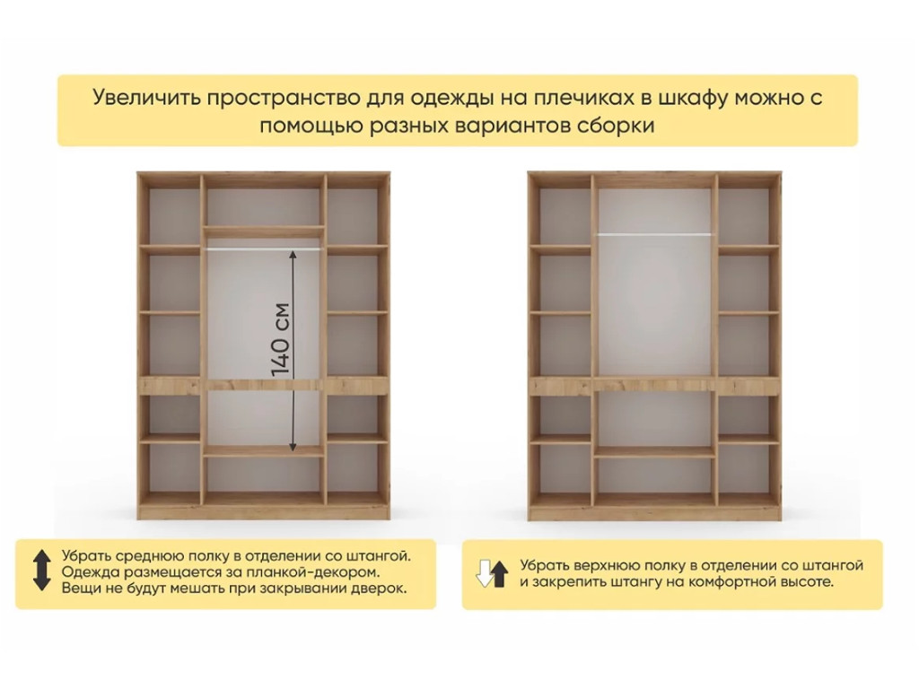 - В отделении со штангой возможно убрать верхнюю полку и поднять штангу выше, так же можно не ставить полку над планкой.